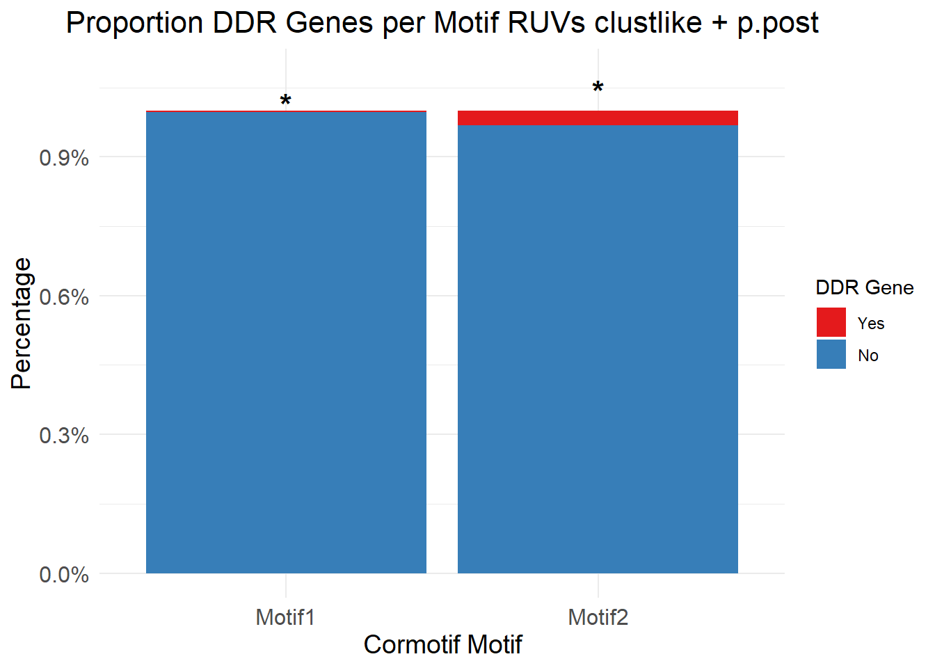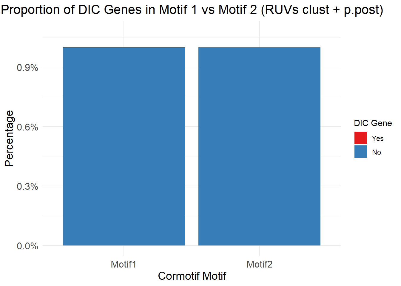 title = "Proportion of p53 Genes in Motif 1 vs Motif 2 (RUVs clust + p.post)",